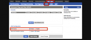 UPnP Setup by Blag | Jan 31, 2015 | 0 commentsUpnP allows media devices to easily and automatically connect to each other. This is commonly used when streaming between devices. This section is part of the NAT/QoS -> UPnP menu. Simply select the Enable radio button and you are good to go!Submit a Comment Cancel replyYour email address will not be published. Required fields are marked *Comment *Name * Email * Website Δ